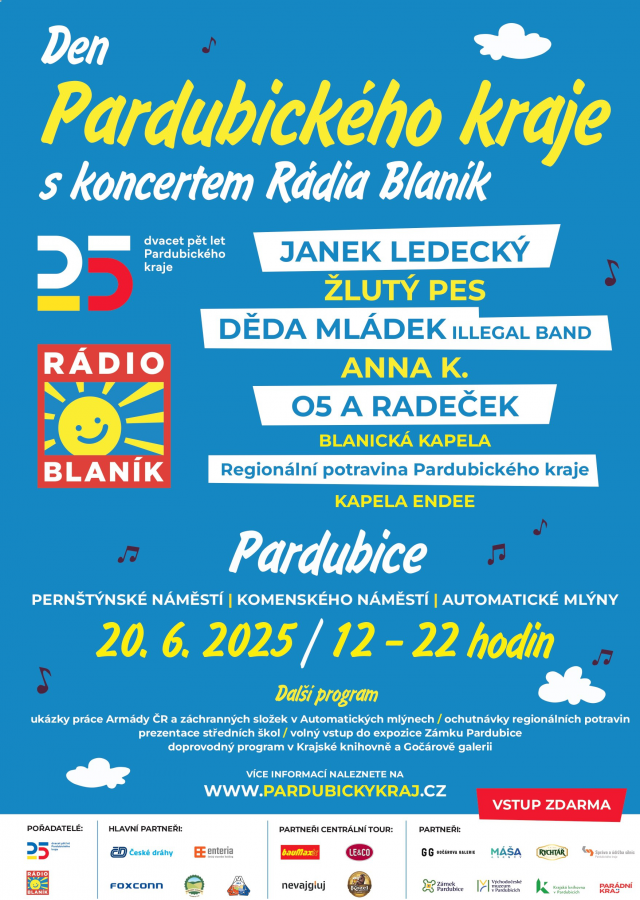 „V loňském roce jsme na Dni Pardubického kraje slavili 25 let existence Rádia Blaník a v letošním roce si role prohodíme, protože obdobné výročí si v letošním roce připomínají české a moravské kraje. Den Pardubického kraje se stal nedílnou součástí červnových akcí v centru krajského města, a proto chceme v této tradici pokračovat i nadále. Pevně věřím, že nejen hudební program na Pernštýnském náměstí, ale například také prezentace složek integrovaného záchranného systému a armády v areálu Automatických mlýnů, či prezentace našich středních škol či ochutnávky regionálních potravin na Komenského náměstí nalákají v pátek 20. června od 12 do 22 hodin do centra Pardubic nejen místní, ale také návštěvníky z celého regionu,“ uvedl hejtman Pardubického kraje Martin Netolický. Hudební program odstartuje ve 12:30 kapela EnDee, na kterou postupně naváží Děda Mládek Illegal Band, Žlutý pes, Blanická kapela, Anna K., O5 a Radeček a celá akce vyvrcholí koncertem Janka Ledeckého.