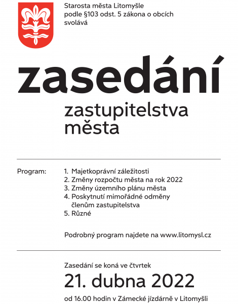 Zveme veřejnost na dubnové jednání zastupitelstva, které se uskuteční ve čtvrtek 21. dubna od 16 hodin v zámecké jízdárně. Na programu jsou například změny územního plánu, rozpočtu města či poskytnutí mimořádné odměny členům zastupitelstva.