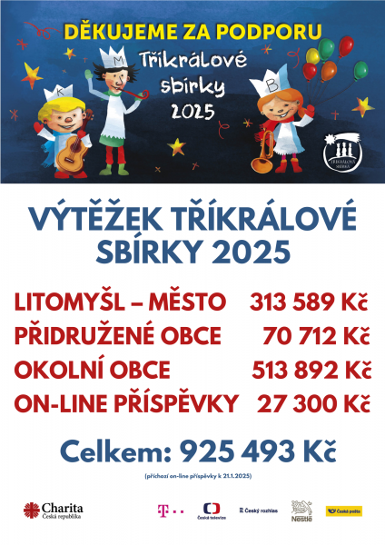 Letošní jubilejní ročník Tříkrálové sbírky je za námi. Všechny kasičky jsou rozpečetěné a opět žasneme nad vaší štědrostí. I přes mrazivé počasí, kterého se nezaleklo 126 kolednických skupinek, se nám společnými silami podařilo v litomyšlském regionu vybrat 925 493 Kč (898 193 Kč byl příspěvek do kasiček a zbytek tvoří bezhotovostní dary, které stále ještě přiskakují)!