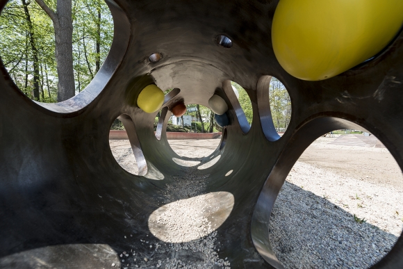 Ikonickou součástí projektu se stalo již zmíněné dětské hřiště s umělecky ztvárněnými herními prvky od sochařů Dušana Zahoranského a Pavly Scerankové. „Prostor nábřeží skýtal ideální příležitost navrhnout hřiště tak, aby fungovalo jako hřiště a zároveň jako místo propojující cesty podél řeky. Chtěli jsme navázat na tradici umělecky ztvárněných hřišť 60. let minulého století, která v posledních 20 letech odezněla, často kvůli tomu, že se zpřísnila legislativa na dětská hřiště, a kvůli obavě, že to bude drahé a komplikované. Chtěli jsme hřiště, které bude nejenom funkční, ale i sochařsky zajímavé,“ říkají architekti Martin Rusina a Martin Frei.