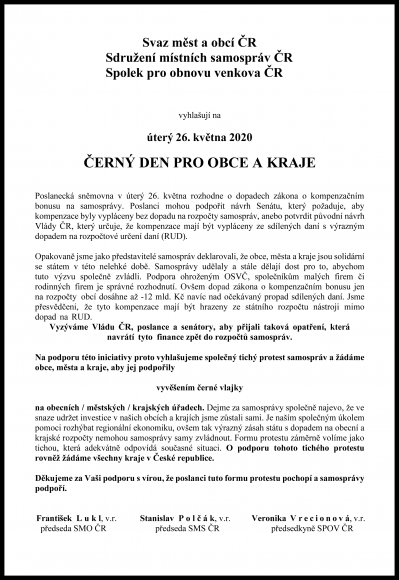 „Opakovaně jsme jako představitelé samospráv deklarovali, že obce, města a kraje jsou solidární se státem v této nelehké době. Samosprávy udělaly a stále dělají dost pro to, abychom tuto výzvu společně zvládli. Podpora ohroženým OSVČ, společníkům malých firem či rodinných firem je správné rozhodnutí. Ovšem dopad zákona o kompenzačním bonusu jen na rozpočty obcí dosáhne až -12 mld. Kč navíc nad očekávaný propad sdílených daní. Jsme přesvědčeni, že tyto kompenzace mají být hrazeny ze státního rozpočtu,“ stojí ve výzvě, jejíž celé znění najdete v příloze.