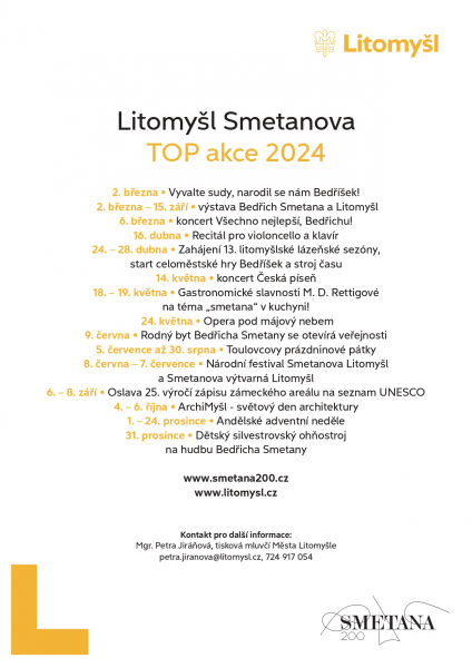Litomyšl si svého rodáka bude připomínat po celý rok, a to nejenom slavnostními koncerty a recitály, ale také v rámci pravidelných kulturních akcí. Již v dubnu například během Zahájení 13. litomyšlské lázeňské sezóny. Letošní Lázně ducha si v duchu recese, která je této akci vlastní, pohrávají s heslem „Smetanův kult je tady furt“. Květnové Gastronomické slavnosti Magdaleny Dobromily Rettigové, nesou opět s jistou nadsázkou podtitul „smetana v kuchyni“. Pro turisty navštěvující Litomyšl vzniká interaktivní hra, která je provede po zajímavých místech spojených s osobností Bedřicha Smetany. Bedříšek a stroj času je dobrodružná úniková hra, zaměřená na rodiny s dětmi a hravé návštěvníky našeho města. Hlavním úkolem bude najít všechny součástky rozbitého časostroje, aby se malý Bedříšek mohl vrátit k rodičům a sestrám, dospět a stát se slavným hudebním skladatelem. Účastníci budou putovat po Litomyšli, hledat indicie, plnit úkoly a nakonec sestrojí stroj času. K tomu, aby se mohli zapojit potřebují chytrý telefon, hrací kartu a najít Bedříškův QR kód. Hru organizuje městská knihovna a bude pro malé i velké k dispozici od dubna minimálně do konce září v Informačním centru Litomyšl. Stejnou populárně naučnou formu, díky níž chce město Litomyšl Bedřicha Smetanu přiblížit i mladším generacím, má také nově vydávané obrázkové leporelo autorské dvojice Petra Braunová a Barbora Brunová, které formou komiksu představí nejdůležitější milníky skladatelova života. Zakoupit si jej můžete v Informačním centru Litomyšl.