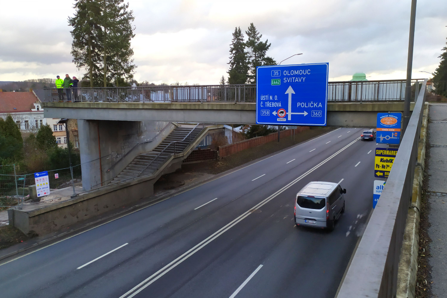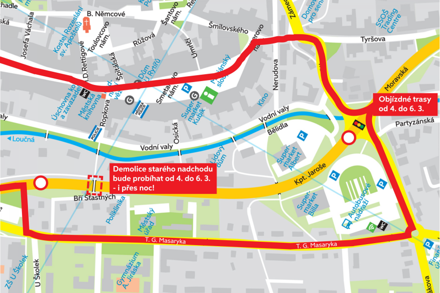 Dodavatelská firma bude na bourání starého nadchodu pracovat i přes noc a v uvedený termín dojde ke kompletní uzavírce silnice I/35 mezi světelnou křižovatkou a odbočkou kolem parkoviště pod základními školami. Doprava bude vedena po objízdných trasách. Jeden směr přes Smetanovo náměstí, druhý směr po ulici T. G. Masaryka, viz příloha dole.