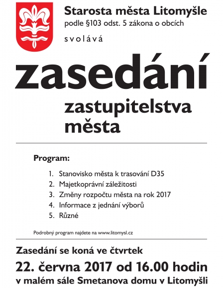 Zveme občany na zasedání Zastupitelstva města Litomyšle, které se koná ve čtvrtek 22. června od 16:00 v malém sále Smetanova domu. Na programu bude projednání stanoviska města k trasování D35, majetkoprávní záležitosti, změny v rozpočtu a informace z jednání výborů.