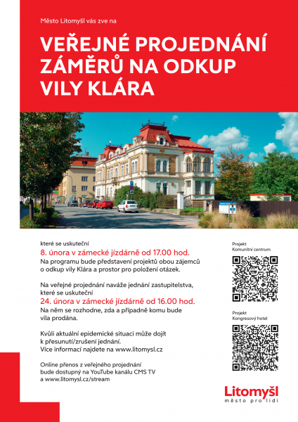 Město Litomyšl zve veřejnost na veřejné veřejné projednání záměrů na odkup vily Klára, které se uskuteční 8. února v zámecké jízdárně od 17 hod. Na programu bude představení projektů obou zájemců o odkup vily Klára a prostor pro položení otázek.