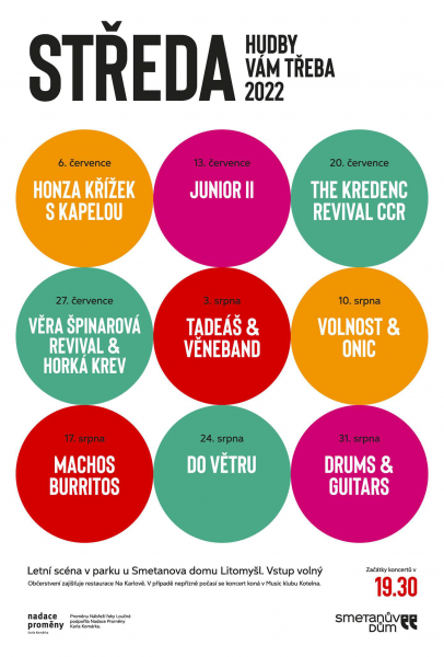 Tradiční prázdninový hudební cyklus Středa, hudby Vám třeba je opět zde! Na nové letní scéně v parku u Smetanova domu uslyšíte osm hudebních kapel z Litomyšle a okolí.