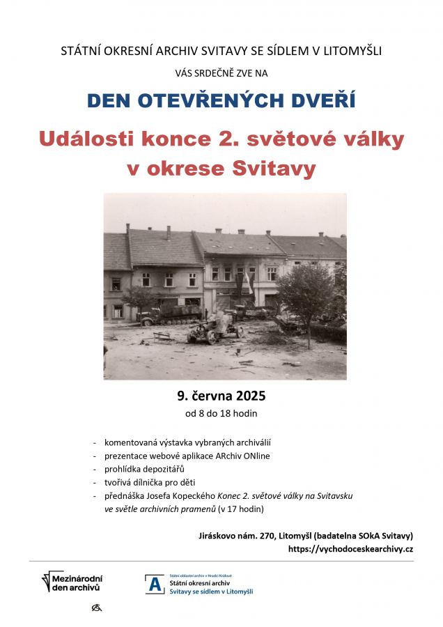 Letošní Mezinárodní den archivů se tematicky zaměří na události konce 2. světové války v okrese Svitavy. Návštěvníci se mohou těšit na komentovanou výstavku vybraných archiválií, prohlídku depozitářů, prezentaci webové aplikace ARchiv ONline, která slouží ke zpřístupnění popisu archiválií a jejich digitalizátů či na tvořivou dílničku pro děti. V 17:00 bude následovat přednáška Josefa Kopeckého na téma: Konec 2. světové války na Svitavsku ve světle archivních pramenů.