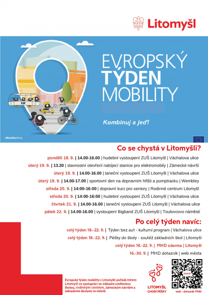 V týdnu od 16. do 22. září proběhne opět i v Litomyšli program v rámci Evropského týdne mobility, který zahrnuje MHD zdarma, otevření nové nabíjecí stanice pro elektromobily, Pěšky do školy - soutěž Základních škol, vystoupení ZUŠ Litomyšl, sportovní den na dopravním hřišti nebo dopravní kurz pro seniory.
