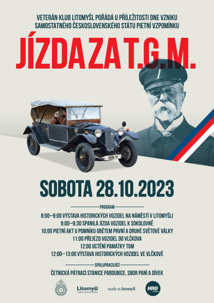 Zástupci Veterán klubu Litomyšl, města Litomyšl, Sboru paní a dívek a Četnické pátrací stanice Pardubice se sejdou na Smetanově náměstí v Litomyšli, aby poté společně v 9 hodin u pomníku padlých v 1. světové válce u sokolovny uctili památku vzniku samostatného Československa. Po skončení se všichni účastnící odeberou do Vlčkova, kde u busty Tomáše Garrigue Masaryka dojde k položení věnců a opětovnému uctění památky.