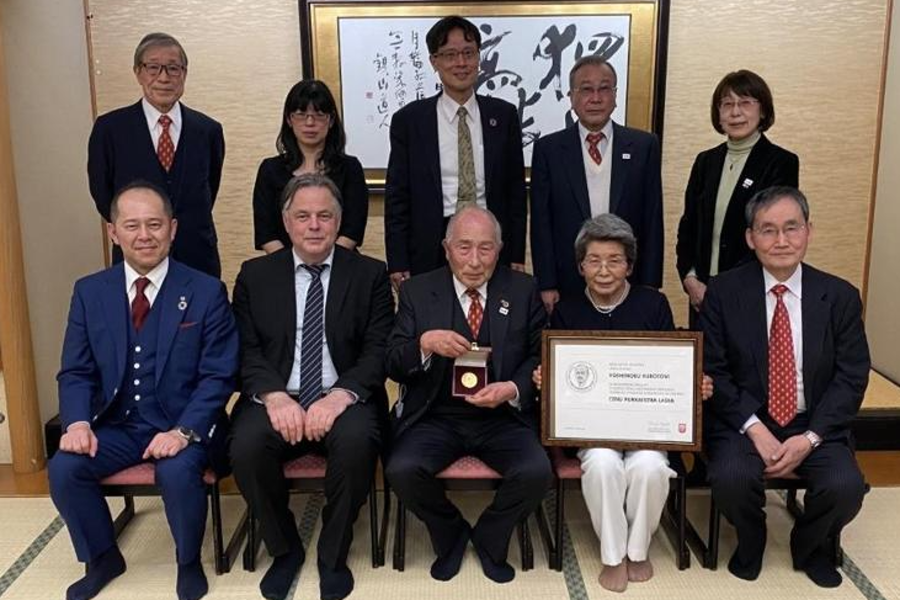 Český velvyslanec v Japonsku Martin Tomčo v polovině března slavnostně předal Jošinobu Kubotovi, předsedovi japonsko-české Asociace Smetanova Litomyšl, diplom a medaili purkmistra Laška.