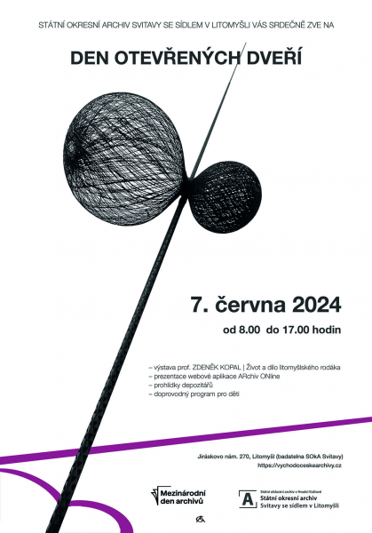 Srdečně zveme všechny zájemce na Den otevřených dveří Státního okresního archivu Svitavy se sídlem v Litomyšli, který se uskuteční v pátek 7. června 2024 od 8 do 17 hodin v centrální budově (Litomyšl, Jiráskovo nám. 270).