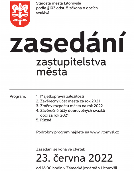 Zveme veřejnost na červnové jednání zastupitelstva, které se uskuteční ve čtvrtek 23. června od 16.00 v zámeckém pivovaru. Na programu budou například majetkoprávní záležitosti, závěrečný účet města za rok 2021, změny stávajícího rozpočtu města, závěrečné účty dobrovolných svazků obcí za rok 2021 či změny územního plánu města.