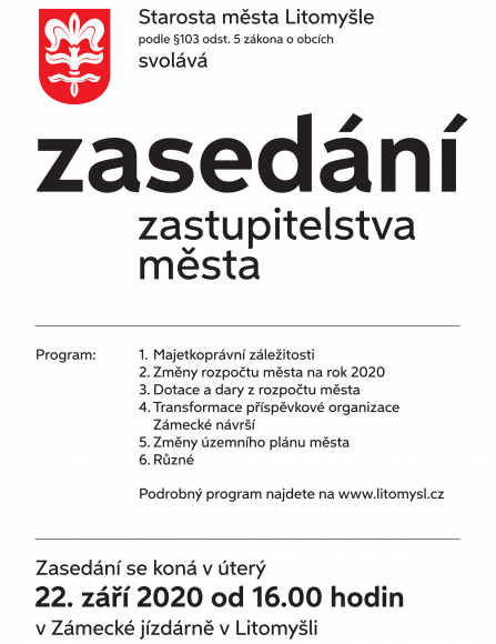 Zveme veřejnost na jednání zastupitelstva města, které se uskuteční 22. září od 16.00 hod. v zámecké jízdárně. Na programu budou majetkoprávní záležitosti, změny rozpočtu města, návrhy na změnu územního plánu a další body. Přesný program bude zveřejněn týden před jednáním na webu města.