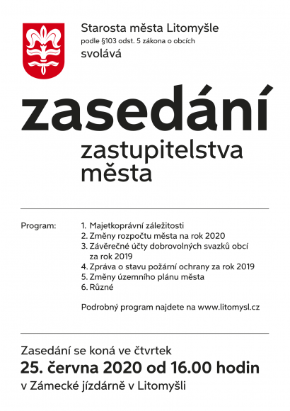 Zveme veřejnost na jednání zastupitelstva města, které se uskuteční 25. června od 16.00 hod. v zámecké jízdárně. Na programu budou majetkoprávní záležitosti, závěrečný účet města za rok 2019, návrhy na změnu územního plánu města či zpráva o stavu požární ochrany.