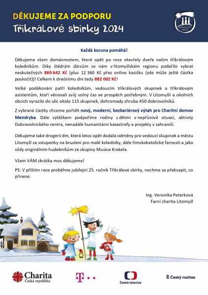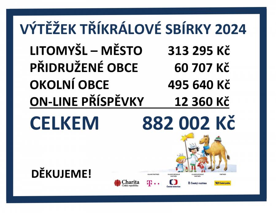 Děkujeme všem domácnostem, které opět po roce otevřely dveře našim tříkrálovým koledníkům. Díky štědrým dárcům se nám v litomyšlském regionu podařilo vybrat neskutečných 869 642 Kč (plus 12 360 Kč přes online kasičku. Celkem tedy 882 002 Kč!