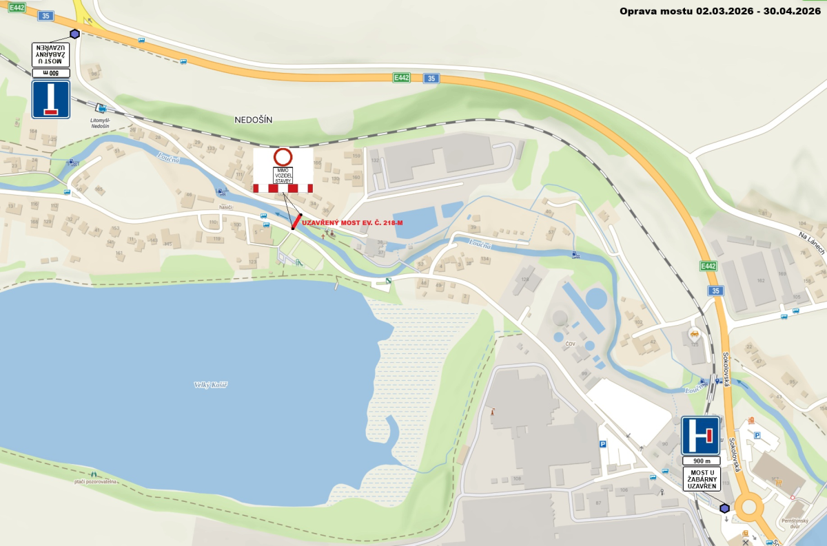 V Nedošíně se připravuje oprava mostu u Hospody Na Žabárně, která si vyžádá úplnou uzavírku a to od 2. března do 30. dubna 2026.