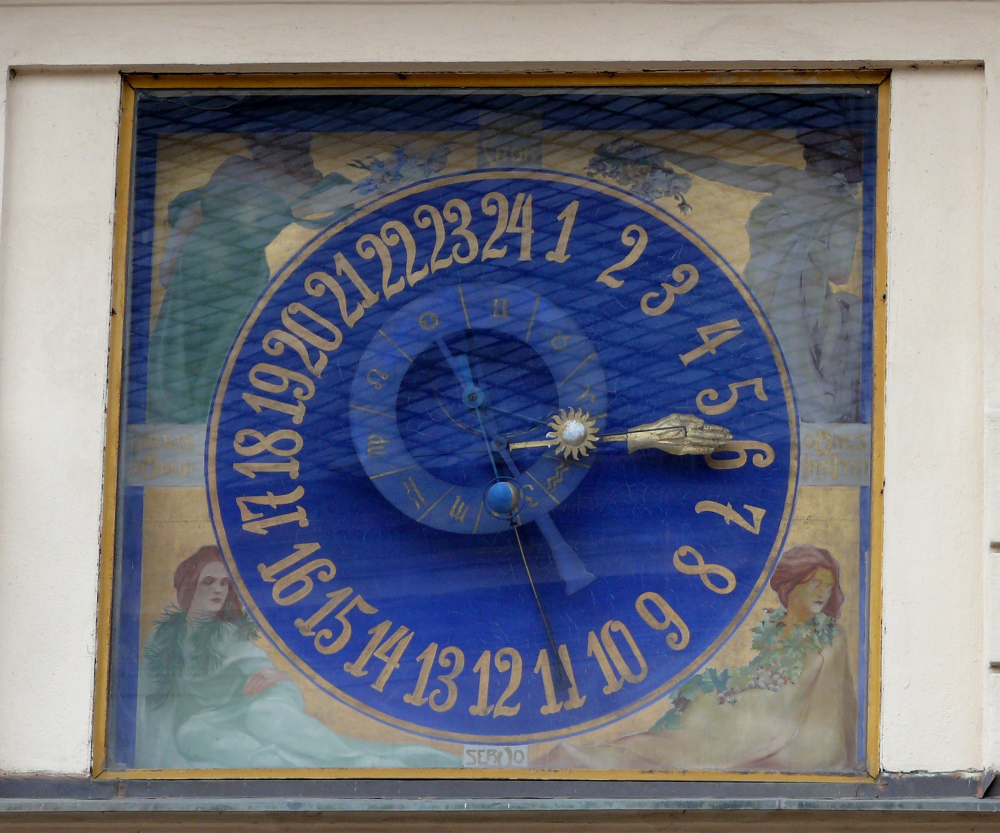 Ve čtyřech rozích desky orloje se na zlatém pozadí nacházejí čtyři ženské postavy symbolizující roční období. Mezi figurami na štítcích uprostřed stran čtverce jsou latinské nápisy, jež při čtení ve směru pohybu hodinových ručiček sestavují větu virtus oMni loco nasCitur, oMnes InvItat serVos reges. (ctnost se rodí na každém místě, všechny vyzývá, otroky i krále). Nápis je též chronogramem, neboť větší písmena uvádějí v římských číslicích letopočet 1907.