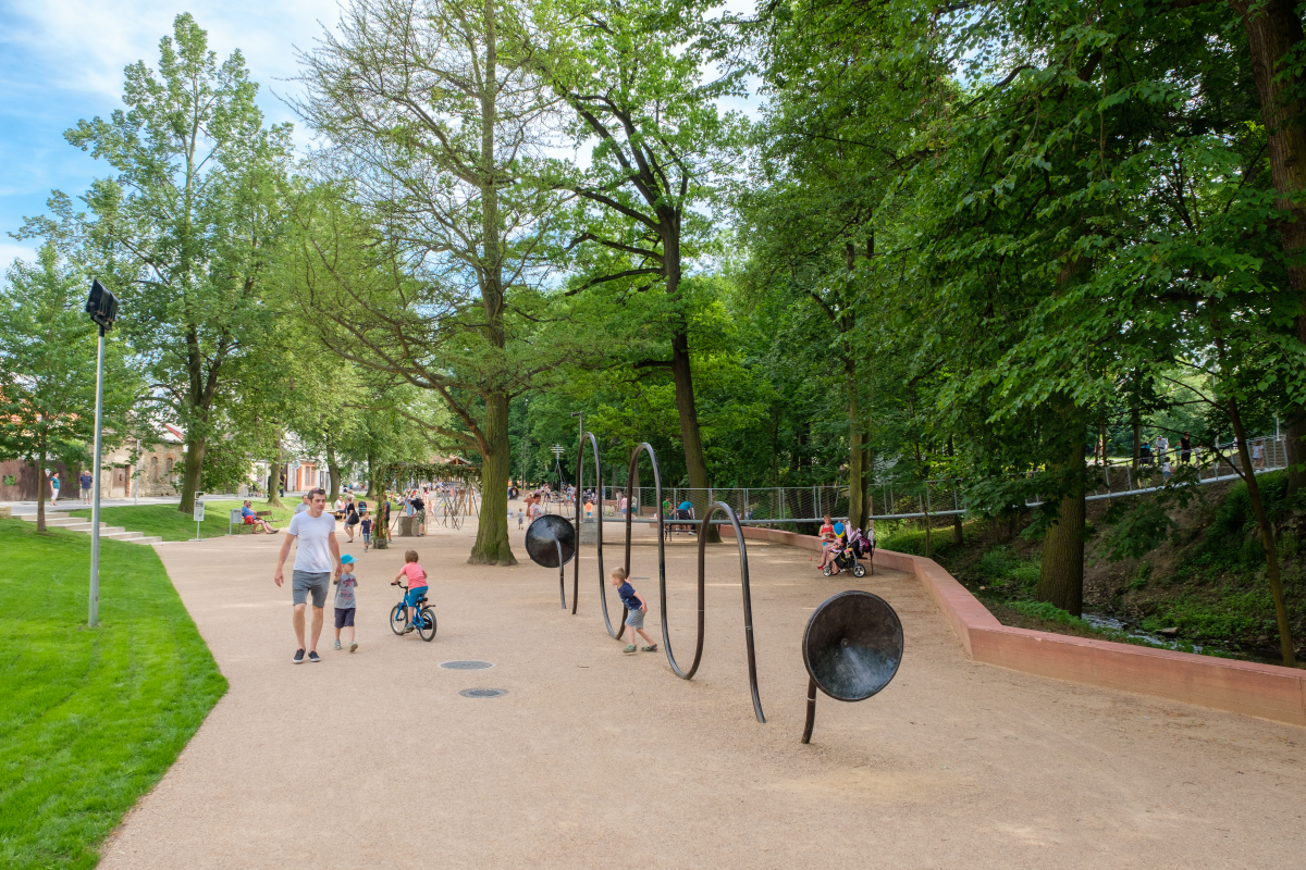 prostor doplňují hravé prvky z dílny sochařů P. Scenkové a D. Záhoranského, ulice Vodní valy