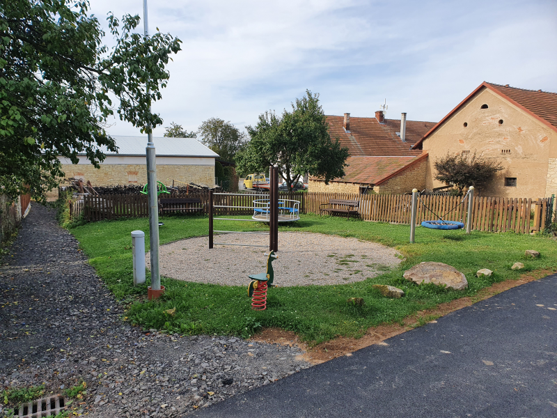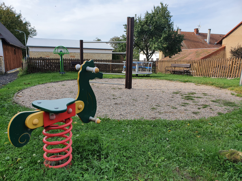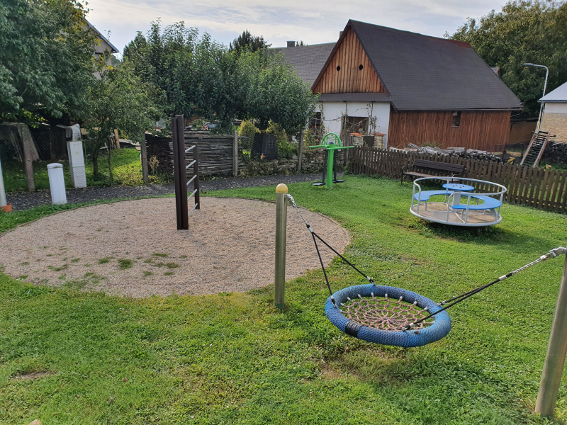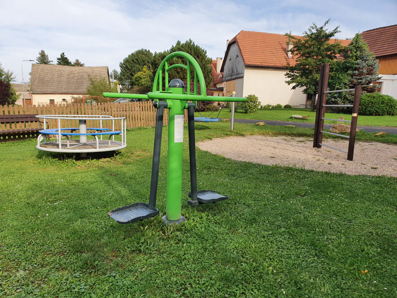 Na ploše je umístěn cvičební stroj a několik herních prvků pro děti