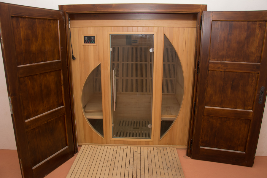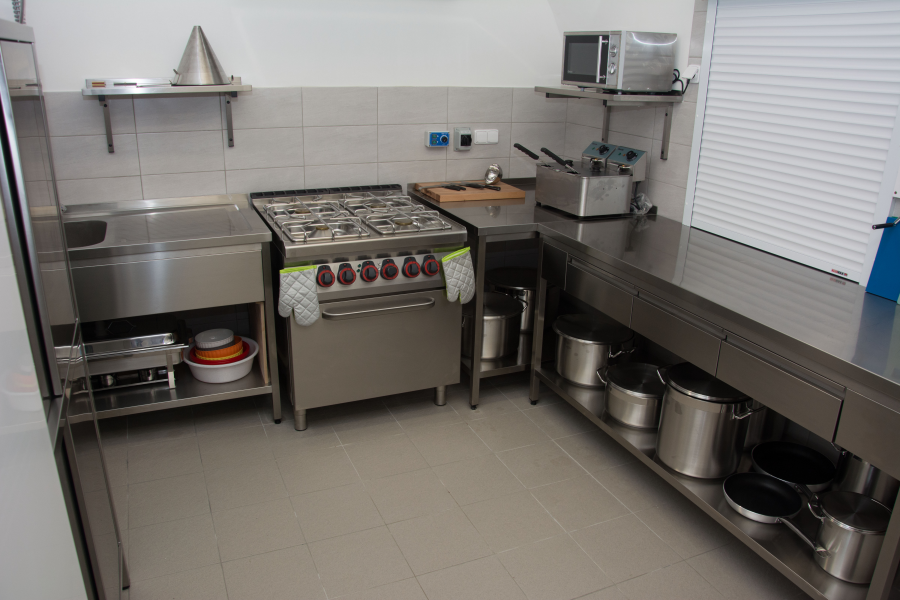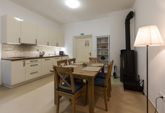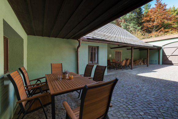 V hospodářské části je k dispozici plně vybavená kuchyň s barem a společenská místnost s toaletami. Ve dvoře můžete využít kryté sezení a infrasaunu.