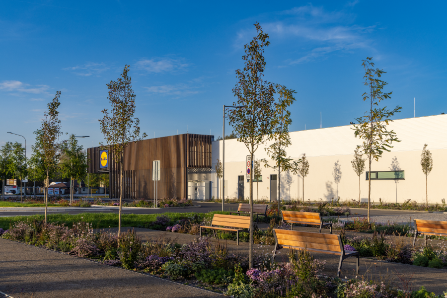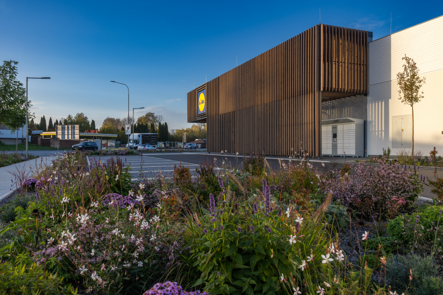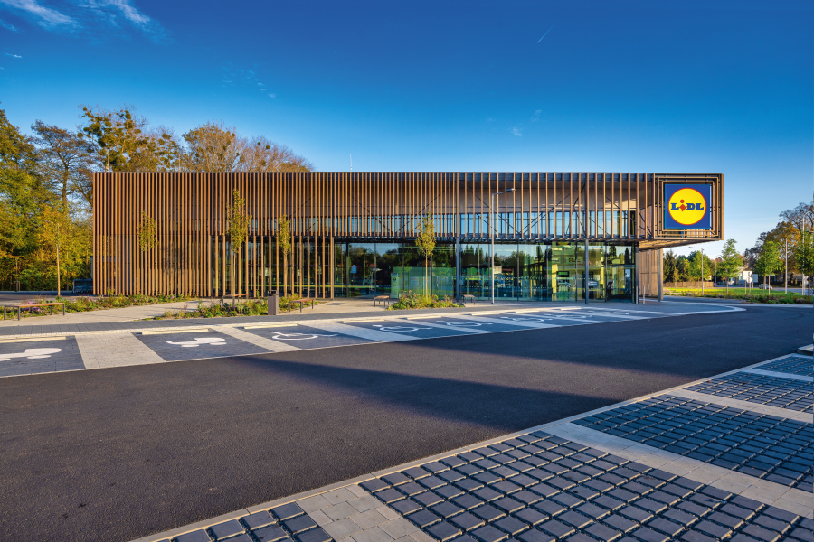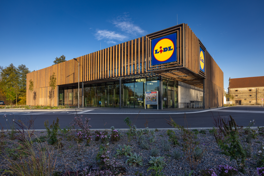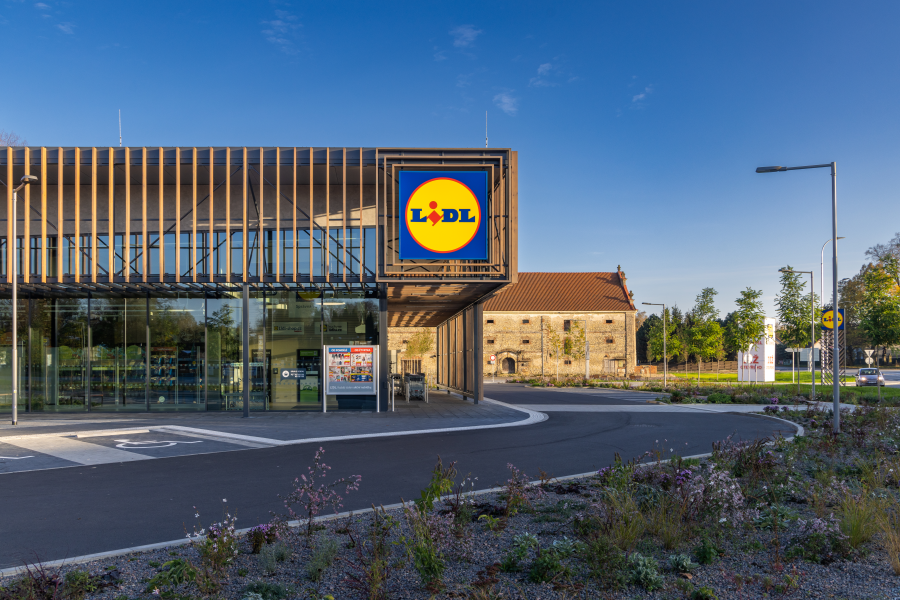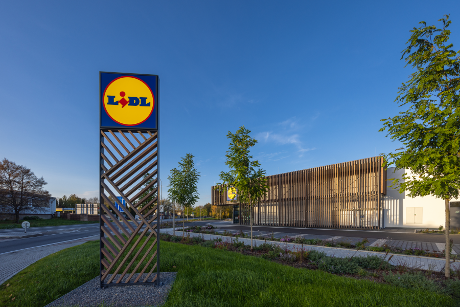 Objekt prodejny je umístěn v lokalitě původního dvora Pernštejnů a je citlivě navázán na zachovanou původní barokní sýpku. Návrh ateliéru VAS architekti (architekt Három) vytváří důstojný a nerušený předprostor před sýpkou, odklání od ní parkovací plochy a je napojen na komunikační systém novou kruhovou křižovatkou. Areál je doplněn velmi kvalitními sadovými úpravami dle návrhu ateliéru Partero, které pohledově utlumují parkoviště, akcentují sýpku a zároveň respektují marketingové principy prodejny. Parter je vybaven kvalitním mobiliářem, použité materiály jsou přírodního charakteru. Vstupní část je zdůrazněna předsazenou markýzou zajišťující stínění prosklené fasády a ochranu před deštěm pro návštěvníky, nákupní vozíky a stojany na kola. Charakteristické svislé lamely po obvodě markýzy akcentují hlavní vstup. Markýza přebírá úlohu designově nejvýraznějšího prvku navrhovaných úprav. Na stavbě nebudou umístěny reklamní billboardy, pouze abstrahované logo Lidlu, které je zakomponováno do opláštění markýzy. Na parkovišti s kapacitou přes 100 parkovacích míst se nachází také dvě elektrodobíjecí stanoviště. Konečná podoba je výsledkem vyzvané architektonické soutěže, kterou v úzké spolupráci s městem zorganizoval vlastník pozemků, firma Agile. Tato realizace významně zatraktivnila příjezd do města ve směru od Vysokého Mýta a v roce 2023 by měla být přes nedalekou řeku zrealizována také nová lávka pro pěší.