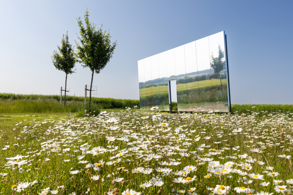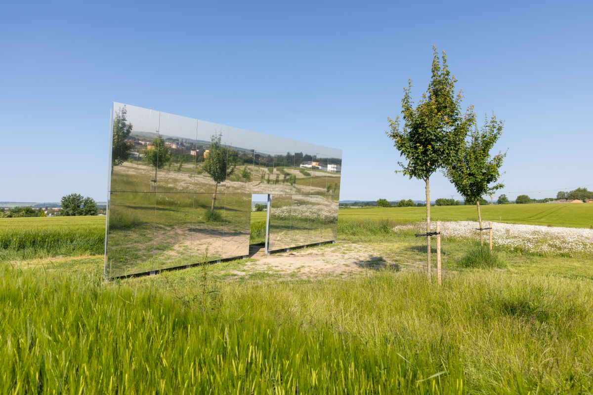 Stěna ze zrcadlového Dibondu o rozměrech 10x4 metry s otvorem – dveřmi, kterými můžete projít „do jiné dimenze“. Objekt v unikátním přírodním Parku Zdeňka Kopala zrcadlí park, okolní krajinu, nebe i panorama Litomyšle.