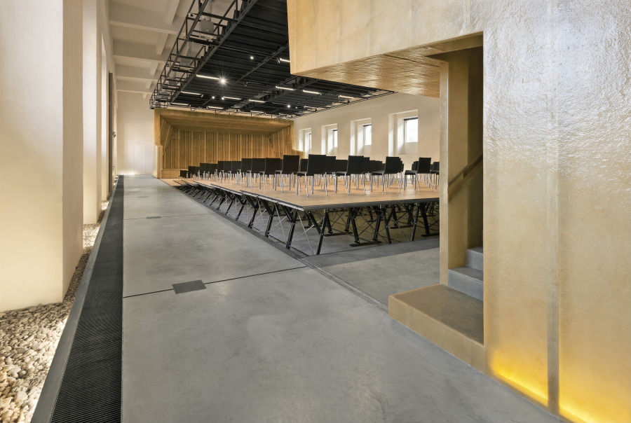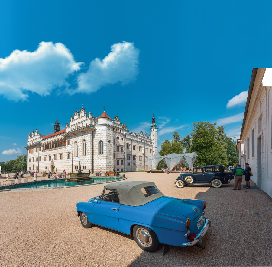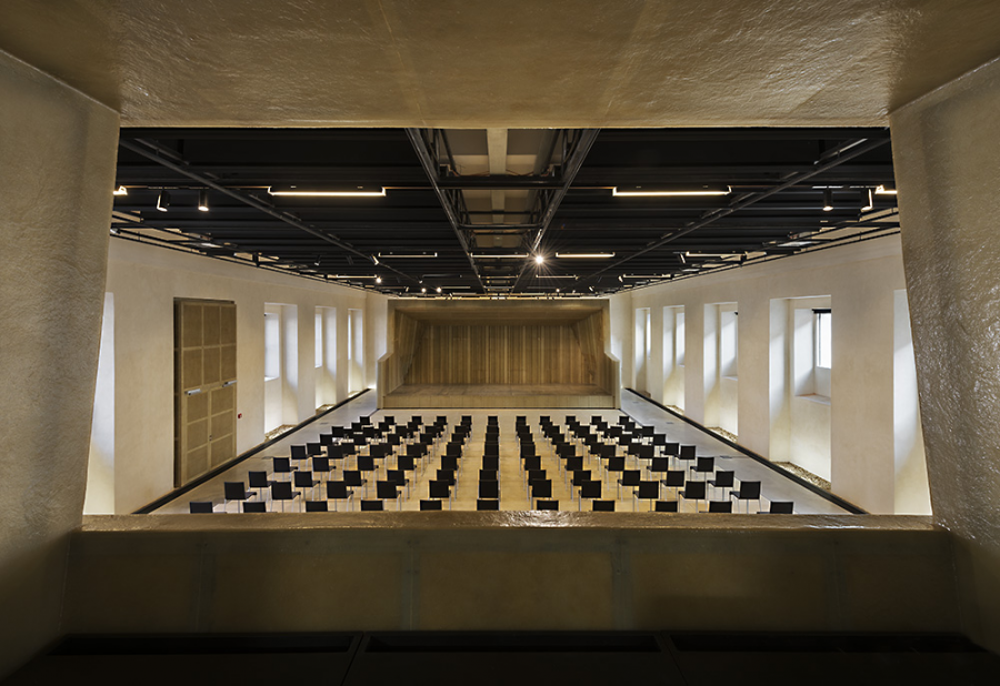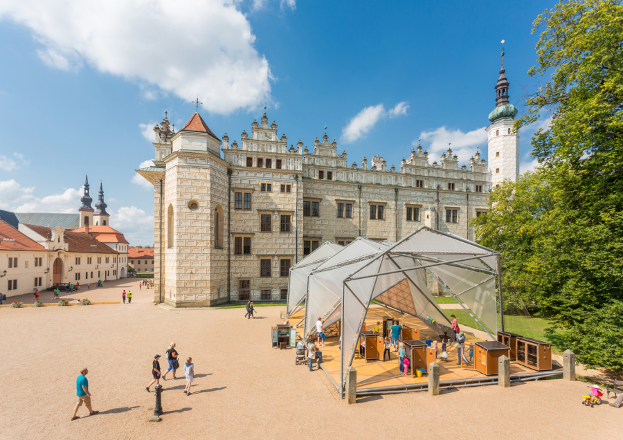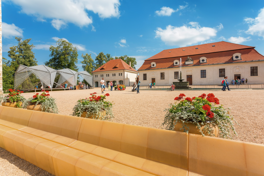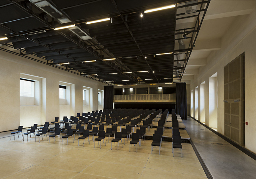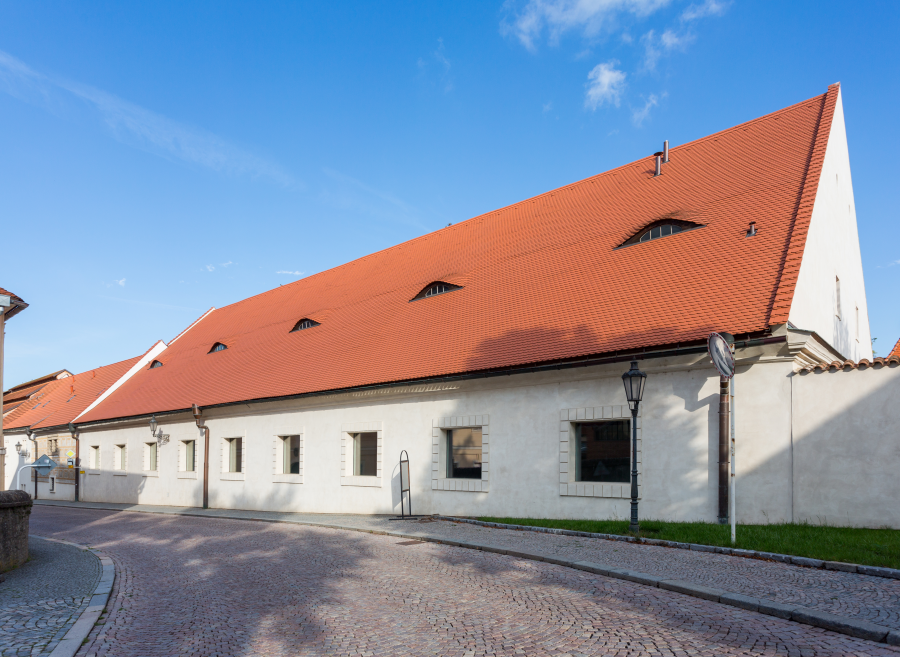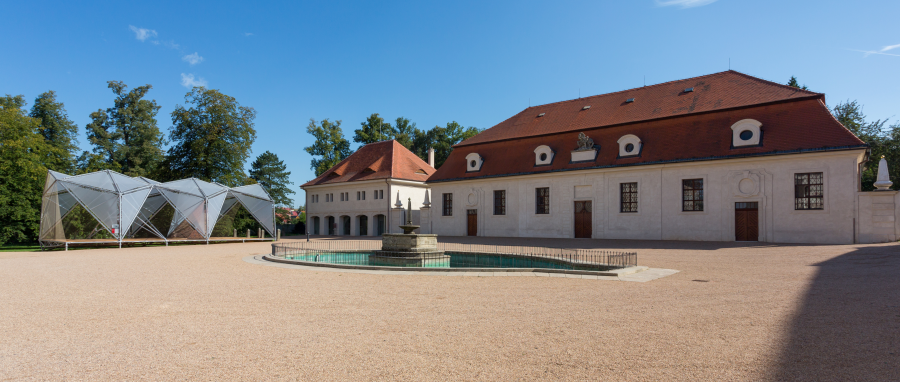 Jízdárna je po staletí důležitou součástí jedinečného areálu zámeckého návrší. První údaje o stavbě jízdárny jsou z roku 1635. Po roce 1726 prováděl obnovu po požáru architekt F. M. Kaňka. V 70. letech minulého století proběhla rozsáhlá úprava celého objektu. Kvůli zajištění dostatečné únosnosti, z důvodu umístění archivu do prostoru podkroví jízdárny, byl v rámci těchto úprav zbudován betonový strop a krov. V návrhu architektů Petra Hájka, Tomáše Hradečného, Jana Šépky, kteří se zasloužili o novou podobu jízdárny, se snažili respektovat alespoň ty části historických konstrukcí, které se nám do dnešních dní dochovaly. Z uliční fronty se obnovila původní velikost okenních šambrán včetně venkovní bosáže. Ve štítové zdi byl zmenšen novodobý vstup do archivu. Funkce archivu byla v podkroví zachována. Z jízdárny se vytvořil multifunkční variabilní prostor vhodný pro pořádání koncertů, promítání filmů, pořádání konferencí i výstav. Nový objekt je složen ze dvou částí – posuvného čela a pevného korpusu. V korpusu jsou umístěny šatny účinkujících, prostor techniků a sociální zařízení pro hosty. Posuvné čelo pojíždí po kolejnicích v podlaze a jako paravan vymezuje prostor pro jednotlivé akce. Tímto způsobem můžeme nastavit proporce prostoru, a tím i jeho akustické parametry. Podlahu tvoří praktikábly, jenž umožňují samostatný zdvih pódia, elevaci hlediště nebo individuální členění podlahy při výstavách. Scénická osvětlovací technika, akustické rezonátory a další potřebné prvky jsou umístěny na nezávislé konstrukci pod stávajícím betonovým stropem sálu. Všechny nové prvky jsou navrženy jako kombinace oceli a průsvitného laminátu lehce jantarové barvy. Šlo o to umístit do zámecké jízdárny jakýsi šperk, který bude mít své kouzlo adekvátně odpovídající prostředí multifunkčního prostoru.