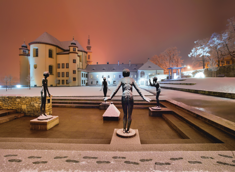 Olbram Zoubek se narodil 21. dubna 1926 v Praze. V roce 1951 se začal věnovat restaurátorské praxi, ke které získal vztah u profesora Josefa Wagnera během svého studia na Vysoké škole uměleckoprůmyslové. Je autorem posmrtné masky Jana Palacha a mj. i Pomníku obětem komunismu na Petříně. V letech 1974 až 1991 restauroval jako režimu nepohodlný umělec sgrafita na zámku v Litomyšli. Do týmu si vybral S. Podhrázského, V. Boštíka a Z. Palcra. Práce trvala sedmnáct sezón. Zde také nalezl, po smrti své první ženy Evy, druhou rodinu a svůj druhý domov. Střídavě žil v Praze a v Litomyšli. Sochy Olbrama Zoubka se staly neoddělitelnou součástí tváře Litomyšle. Jeho sousoší zdobí i Klášterní zahrady. V zámeckém sklepení si můžete prohlédnout stálou expozici soch O. Zoubka, kterou Mistr věnoval městu Litomyšl.