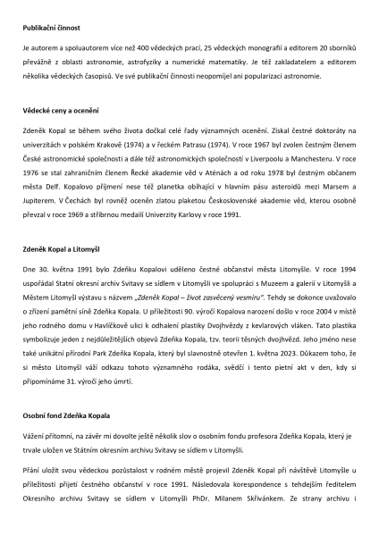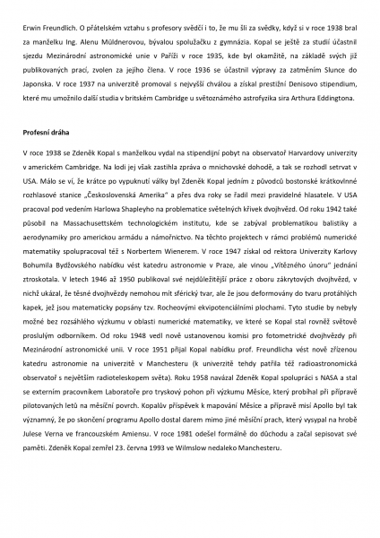 Zdeněk Kopal se narodil 4. dubna 1914 v Litomyšli. Místo, kde stával jeho rodný dům, připomíná plastika dvojhvězdy od Federica Díaze a Mariána Karla. Vystudoval Přírodovědeckou fakultu Univerzity Karlovy, obor matematika, fyzika a astronomie. Před ukončením studia se v roce 1936 zúčastnil vědecké výpravy do Japonska s cílem pozorovat úplné zatmění Slunce. Po ukončení studií získal stipendium na univerzitě v Cambridgi, poté studoval i na Harvardu. Po válce přijal místo profesora astronomie na univerzitě v anglickém Manchesteru, kde působil až do konce svého života. Kopal později vzpomínal, že Litomyšl pro něho byla místem, kde strávil několik důležitých let v době, kdy se utvářela jeho osobnost. Podílel se na přípravách projektu Apollo, a to sestavením podrobné typografie Měsíce. Jeho hlavní přínos v astronomii spočívá ve studiu těsných dvojhvězd. Význam tohoto rodáka z Litomyšle byl potvrzen i v anketě o nejvýznamnějšího českého astronoma XX. století, ve které jednoznačně zvítězil.