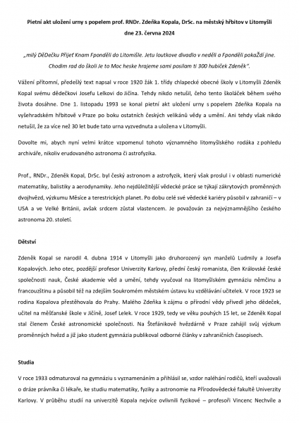 23. června 2024 tedy v den výročí Kopalova úmrtí proběhl na litomyšlském městském hřbitově pietní akt, během něhož byla uložena urna s ostatky Z. Kopala do nového hrobového místa. Ostatky sem byly převezeny z pražského Vyšehradu. Stalo se tak na přání rodiny. Místo posledního odpočinku prof. Kopala na litomyšlském hřbitově najdete na mapě hrobových míst významných osobností.