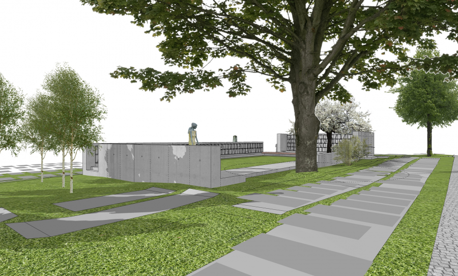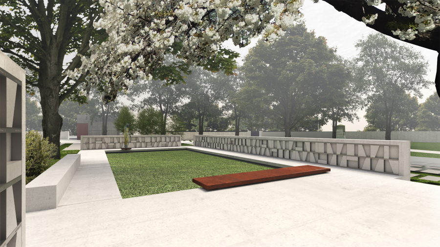 Z důvodu výstavby nového kolumbária dojde k odstranění tújí. Kompozice louky tak bude zakončena stávajícím březovým hájkem. Mezi břízkami a loukou bude na hraně betonové platformy umístěna socha Olbrama Zoubka s cortenovým podstavcem. Rozptylovou louku v obvodu doplní dlouhá betonová lavice. Materiálové řešení podtrhne celkovou atmosféru architektonického řešení. Pracuje se dvěma základními materiály – pohledovým betonem a cortenovým ocelovým plechem. Beton a ocel s korodovanou povrchovou úpravou navazuje na realizaci zázemí hřbitova a završuje současnou architektonickou intervenci do prostoru hřbitova. Současný moderní výraz stavby vkládá do časoprostoru hřbitova soudobý prvek a pokračuje v historické kontinuitě celého území – posvátného místa.