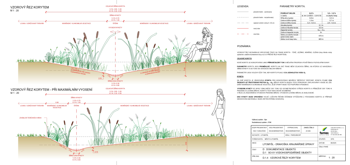 Těžištěm projektu je přeložení trasy potoka Drahoška a vytvoření podmínek pro tvorbu přírodě blízkého koryta. Tok byl v minulosti odsunut na kraj nivy, aby bylo umožněno zemědělské hospodaření v údolí. Návrh alespoň zčásti navrací potok do přirozené trasy a dává mu přirozenější podobu s možností dotvoření koryta samotnou přírodou. Pod hrází bude na konci zájmového území vybudován terénní val, který případné rozlivové vody svede do původního koryta. Nově je zde navrženo koupací jezírko bezprostředně pod hrází s maximální hloubkou vody 1,5 m. Primární funkcí tůně - jezírka, je v tomto případě funkce rekreační. Účelem je soustředit rekreaci kolem hráze v návaznosti na zázemí dětského hřiště a občerstvení. Tomu bude přizpůsobeno řešení jezírka i jeho okolí. Kromě rekreační zóny bude však mít jezírko i zónu přírodní, která bude ponechána bez přístupu lidí mokřadní vegetaci a živočichům. Jezírko bude průtočné, napájené povrchovou vodou z Drahošky. V suchých měsících bude možnost jezírko dopouštět. Přítokové koryto do jezírka bude napojeno na původní koryta pod hrází. Z jezírka bude pokračovat nové koryto skrz celou spodní část řešené lokality a na jejím konci se bude zase napojovat na koryto původní. Součástí jezírka bude i pláž, molo, kamenné či betonové zídky, pobytové schody a další pobytové prvky zpříjemňující jeho rekreační využití. Okolí jezírka bude zatravněno. Je možné, že vybudování jezírka bude realizováno až v další fázi, v závislosti na finančních možnostech a podmínkách případné dotace.