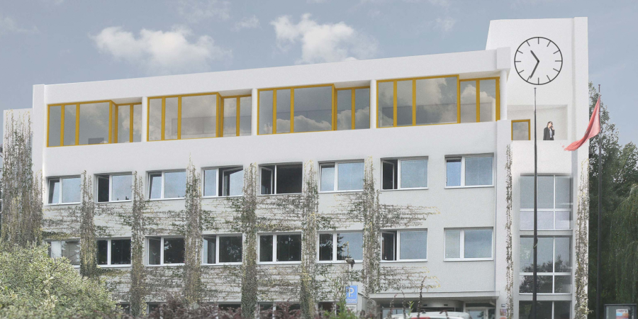 Směrem do ulice T. G. Masaryka je část hmoty nástavby (v místě zasedací místnosti) vytažená nad úroveň nové střechy. V této vyvýšené hmotě jsou umístěna vysoká okna s nízkým parapetem, prostor zasedací místnosti tak nabyde reprezentativní charakter. Po fasádě dále pokračuje užší pásové okno. Prosklené plochy jsou z jihozápadu stíněny stříškou.