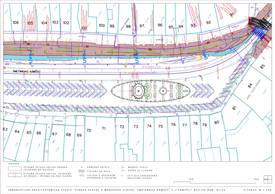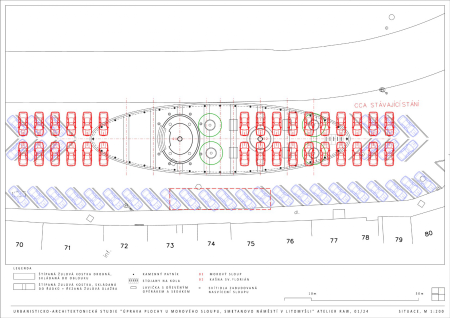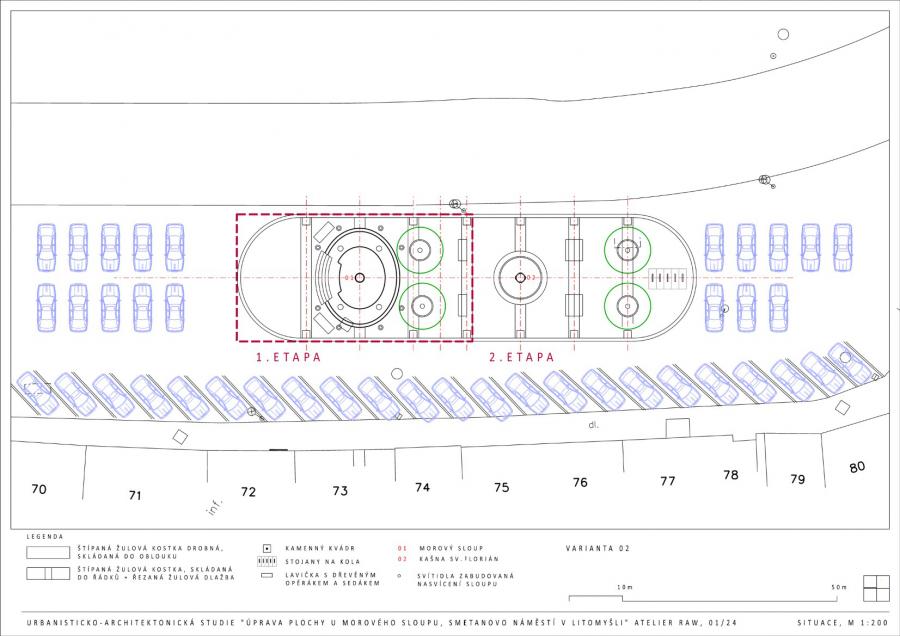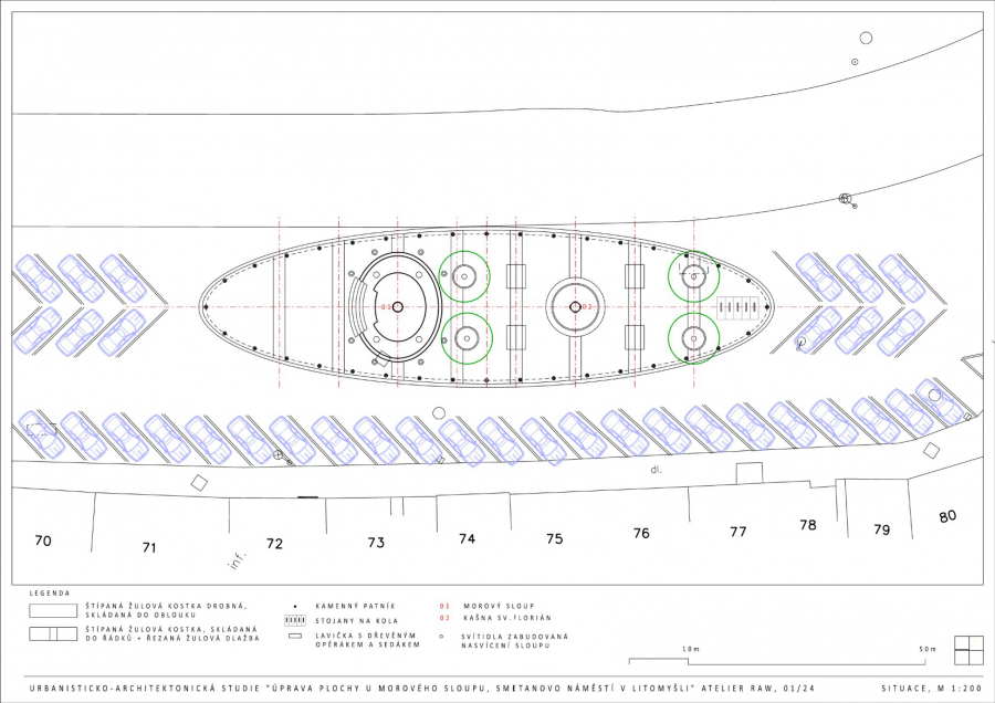 Prostor v okolí morového sloupu by měl být vymezen tak, aby byl bezpečným místem pro chodce a návštěvníky města a poskytl možnost prohlídky památky a posezení ve stínu stávajícího i nově vysazených stromů. Vytváří zde za tímto účelem jednoduchou a přehlednou eliptickou plochu, tvořenou kamenným obrubníkem zvednutým o 2 cm (splňuje požadavky na bezbariérovost). Plocha bude tvořena stávající kamennou dlažbou, skládanou do vějířů, traktovanou pásy dlažby skládanými na sraz do linií. Plocha kopíruje stávající terén a stávající průběh schodů morového sloupu. Po obvodu plochy jsou navrženy žulové patníky dostatečně vymezující prostor.
