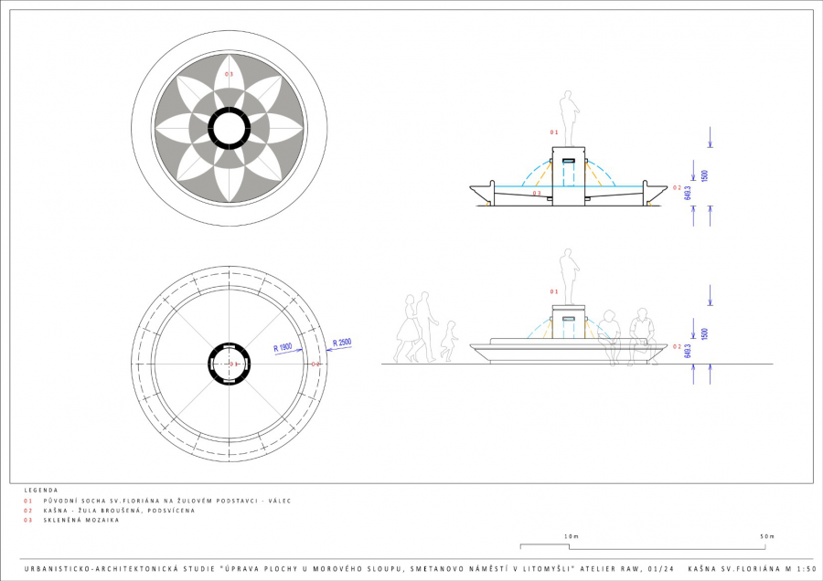 Ke zpříjemnění této klidové zóny pro návštěvníky přispěje také nově navržená kašna se sochou sv. Floriána, přenesenou z prostoru parku pod kostelem Povýšení sv. Kříže, která tak bude navrácena na své původní místo. Vznikne zde příjemný prostor, v letních měsících chráněný stínem vzrostlých stromů a občerstvovaný přítomností vodní plochy. Kašna je koncipována jako klasická městská kašna se čtyřmi chrliči vody do nádrže s konstantní vodní hladinou. Na kamenném válci s tryskami bude umístěna socha sv.Floriána, která byla umístěna na původní kašně. Dno kašny je navrženo ze skleněné mozaiky s florálním motivem, evokujícím lilii - inspirovanou znakem města. Obruba kašny bude vyrobena z broušené žuly a je navržena tak, aby bylo možné na ní sedět a dostat se tak k blízkosti vodní hladiny. Kašna bude ve večerních hodinách podsvícena, stejně jako by byl nasvícen morový sloup.