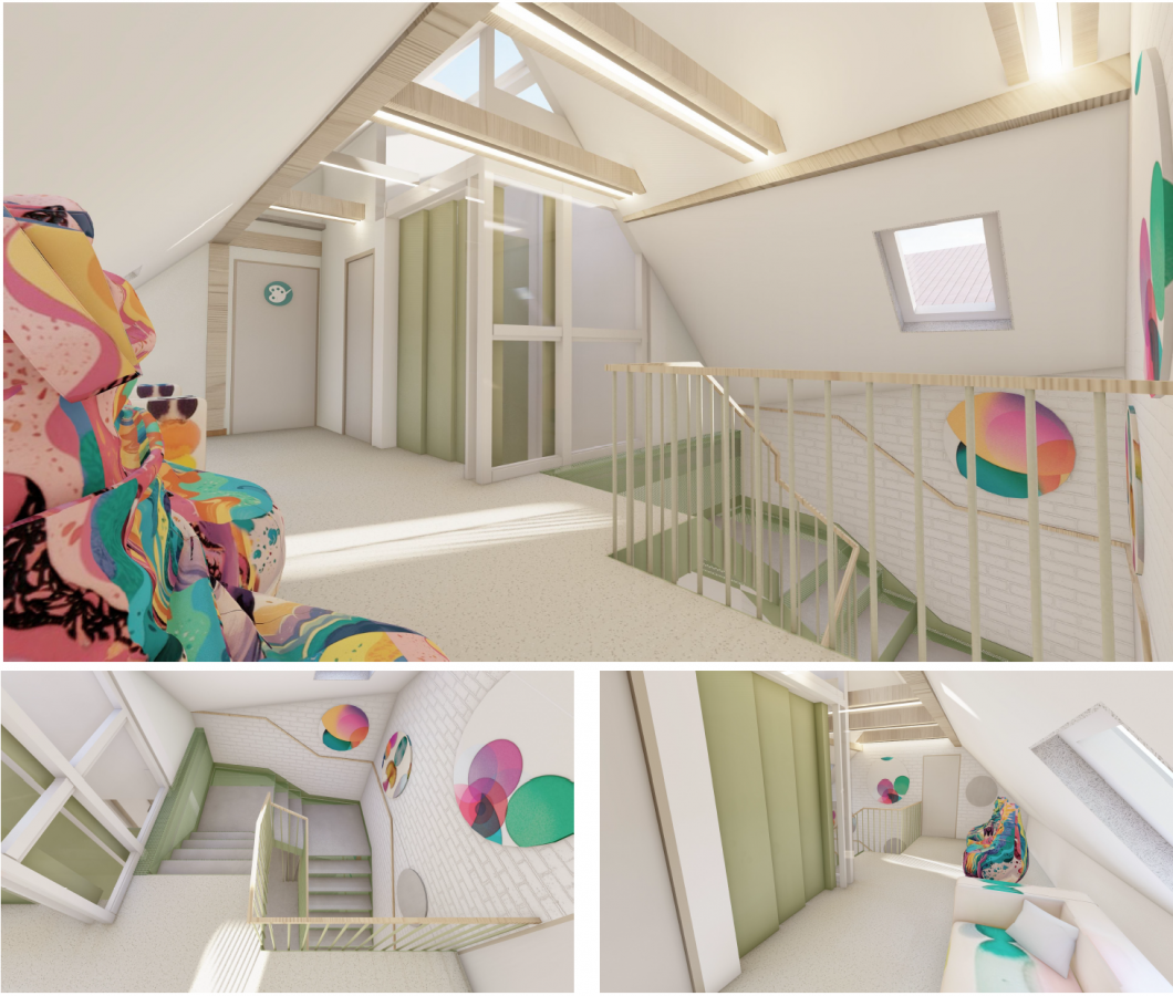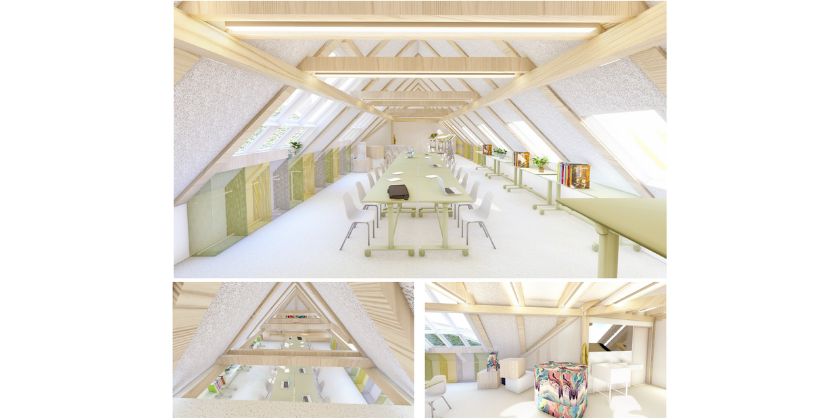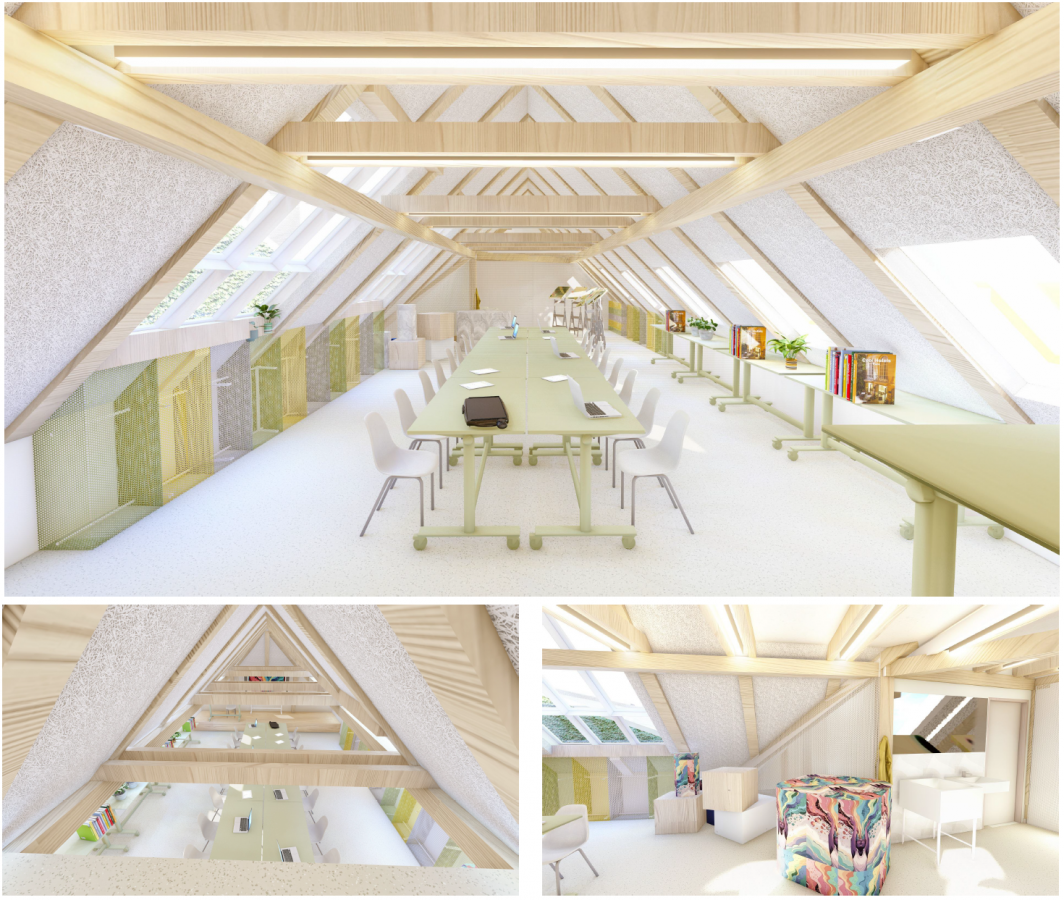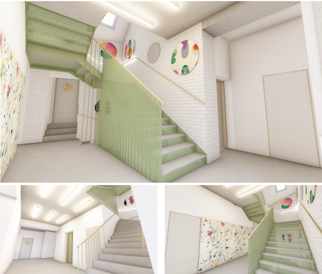 Stávající objekt je dvoupodlažní s půdním prostorem (podkrovím). Předmětem půdní vestavby je vytvoření výukového prostoru pro výtvarné a grafické práce /ateliér/, komunikačního prostoru, sociálního zařízení a skladu s technickým vybavením . Kapacita nové učebny bude 15 žáků + 1 učitel. Ve druhém nadpodlaží vznikne nově sborovna a zázemí pro učitele.