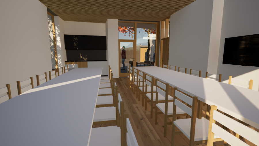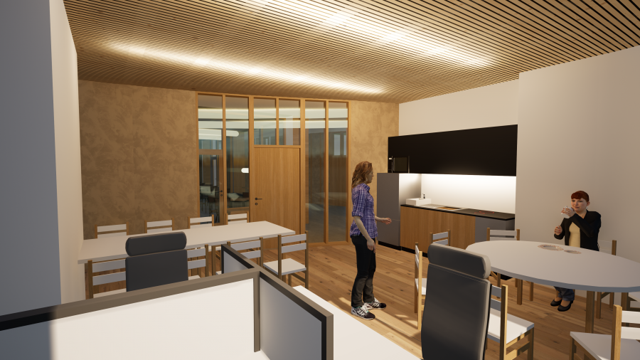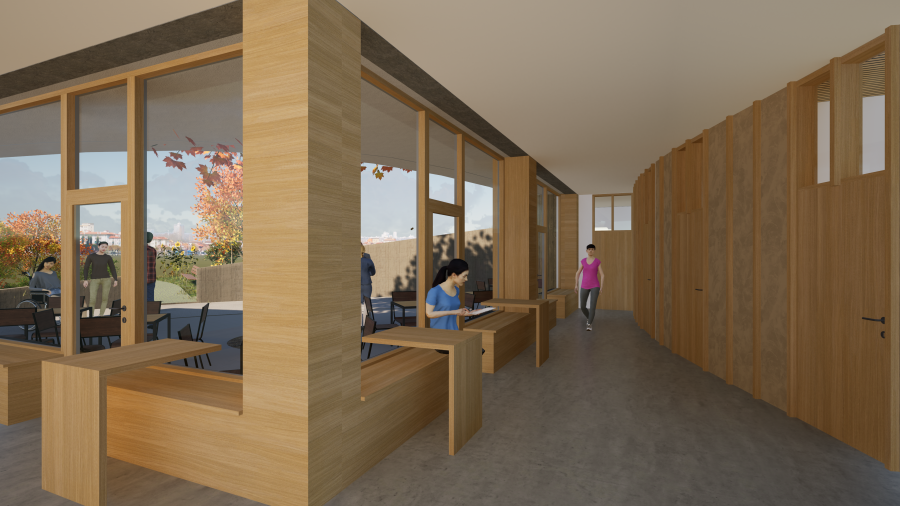 Zázemí pečovatelské služby zahrnuje kanceláře, denní místnost pečovatelek, školící místnost s kapacitou až 40 osob, prostor pro ticho, šatny a hygienické zázemí, sklad pomůcek a bezbariérovou koupelnu, která bude sloužit jako sociální sprcha. Venkovní prostor zahrnuje kromě terasy technické zázemí a parkoviště pro služební vozidla. Celý prostor bude pěšími komunikacemi napojen na ulice Trstěnická a Průmyslová.