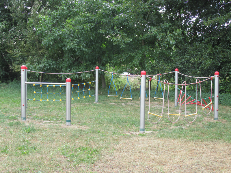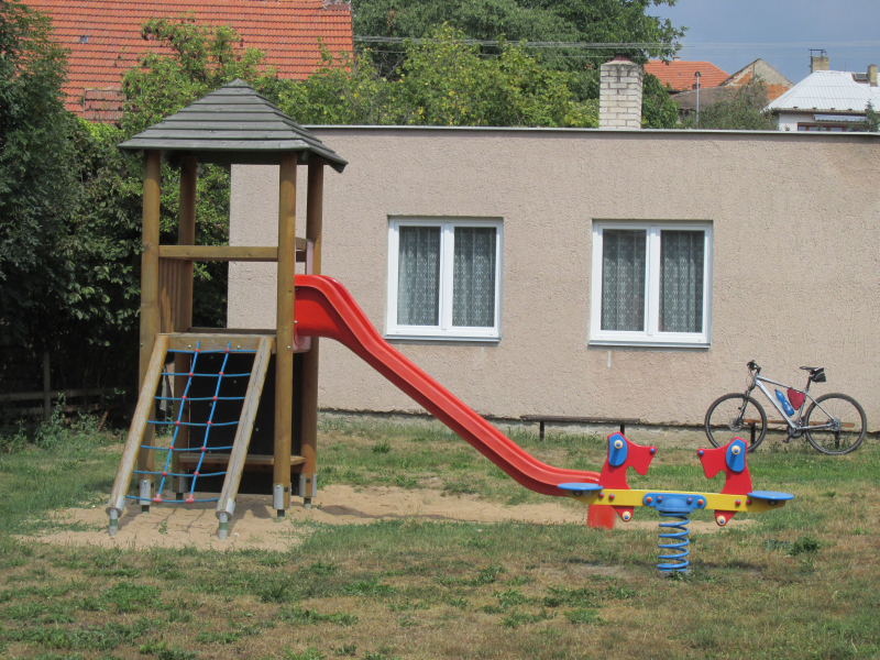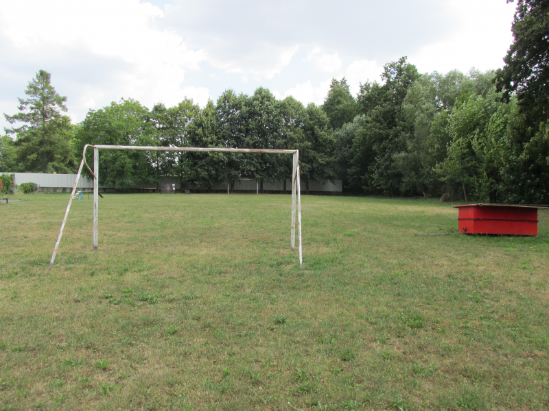 Travnaté neoplocené hřiště pro fotbal a herní prvky pro nejmenší děti
