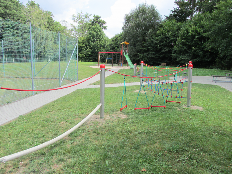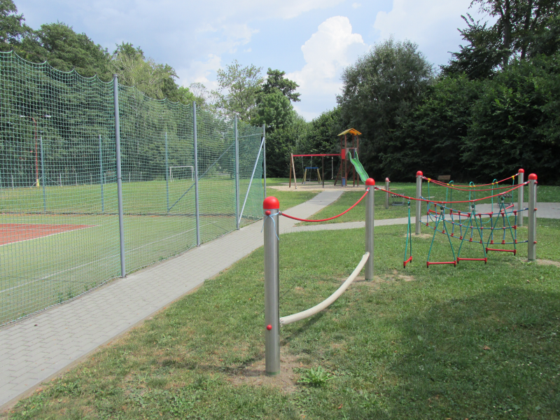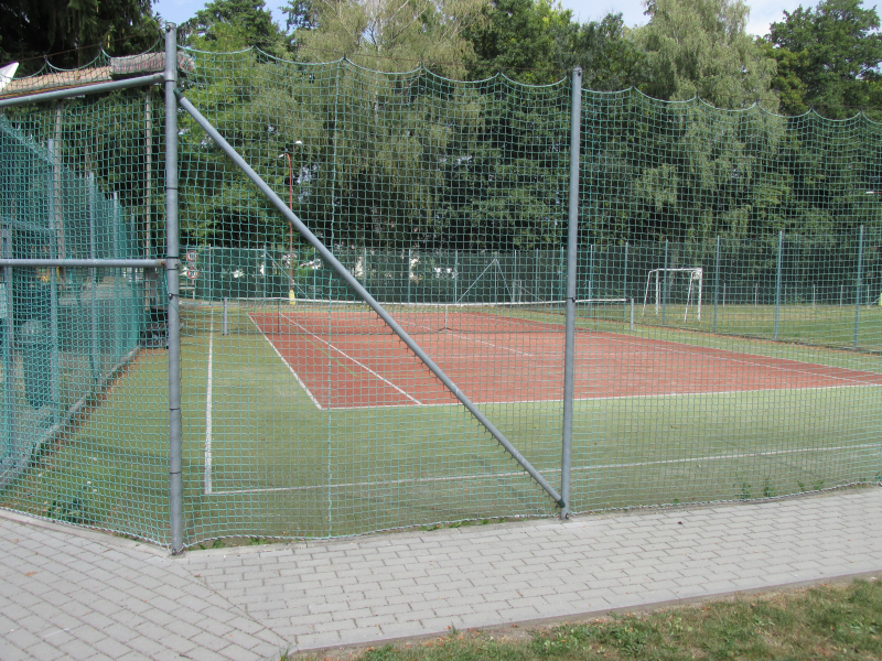 Oplocené hřiště s umělým povrchem lze využít pro tenis, nohejbal, volejbal