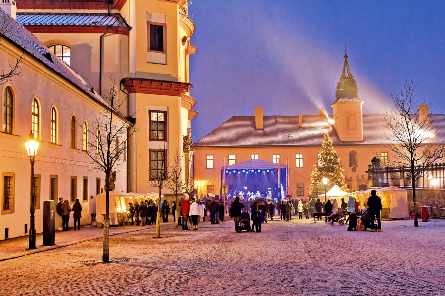 O adventních nedělích můžete strávit příjemné odpoledne na Zámeckém návrší v andělské společnosti. K adventní pohodě jistě přispěje vánoční hudba a vystoupení na pódiu před chrámem Nalezení sv. Kříže, výstava betlémů, dobré jídlo a pití a bohatý doprovodný kulturní program. První adventní neděle je spojena s rozsvícením vánočního stromu. Na Štědrý den se koná oblíbené koledování.