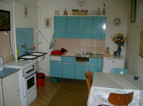 WC a sprcha na společné chodbě, kuchyňka (plynový sporák, lednice, mikrovlnka, nádobí na vaření).