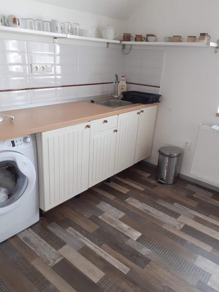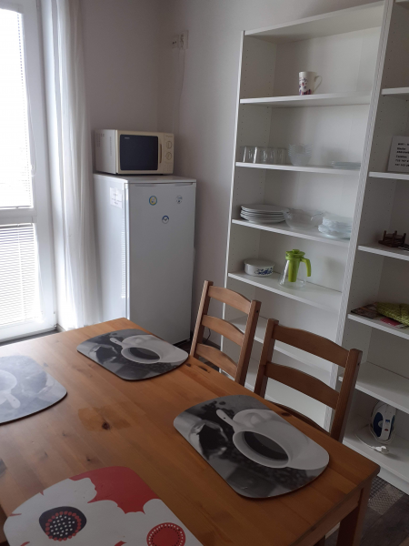 Společná kuchyňka: elektrický sporák, mikrovlnná trouba, lednice, základní vybavení kuchyňské linky