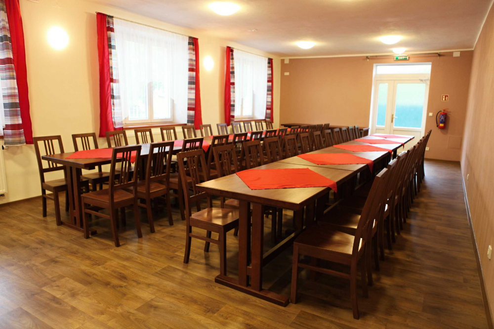 Společenská místnost s vybavenou kuchyní vhodná na svatební hostiny, rodinné oslavy, školení a smuteční hostiny.